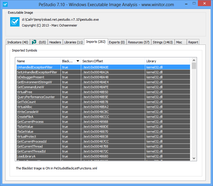 Bahkan sebuah file biner atau malware yang mencurigakan harus berinteraksi dengan sistem operasi untuk melakukan aktivitasnya . Untuk ini menjadi mungkin , sejumlah perpustakaan harus digunakan . PeStudio mengambil perpustakaan dan fungsi-fungsi yang digunakan oleh gambar . PeStudio juga termasuk file XML yang digunakan untuk blacklist fungsi ( misalnya Registry , Proses , thead , file , ... ) . File blacklist dapat disesuaikan dan diperpanjang sesuai dengan kebutuhan Anda sendiri . PeStudio menunjukkan maksud dan tujuan dari aplikasi dianalisis .